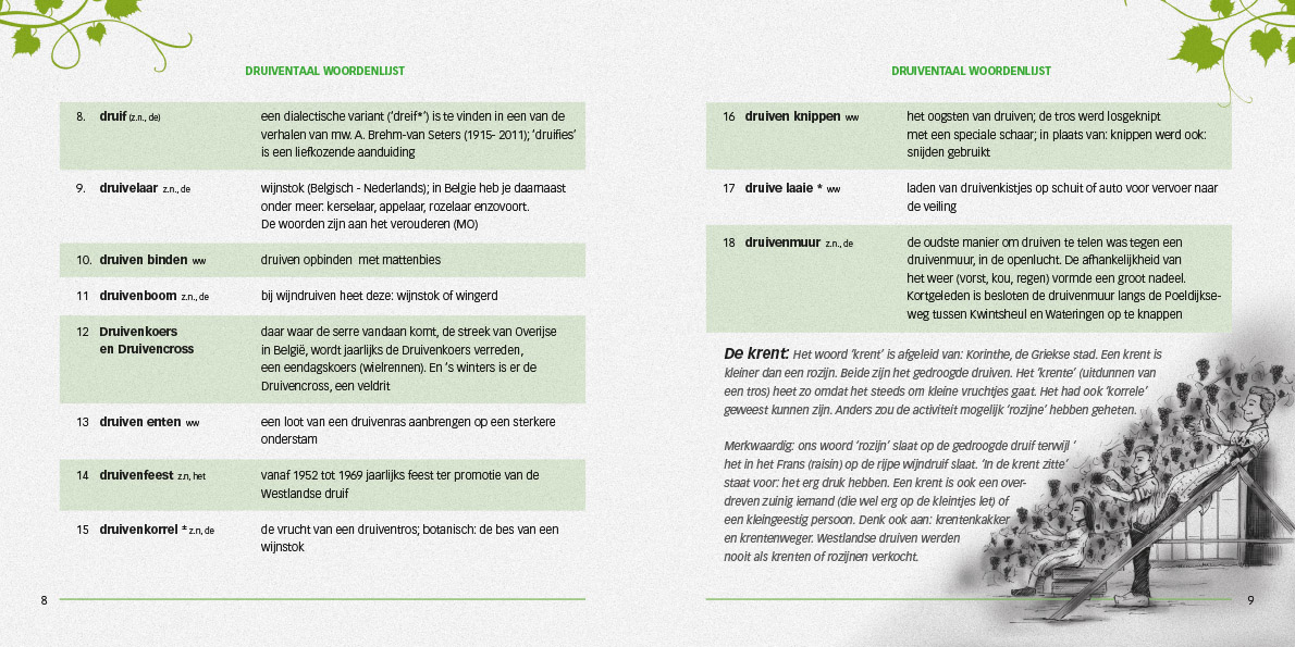 Westlandse druiven zijn om van te watertanden — en de druiventaal is minstens zo smakelijk. Wat dacht je van woorden als dauw, meeldauw, lessenaar, kopkas, tissie en eenpitter? In dit boek vind je 100 unieke Westlandse woorden die vroeger gesproken werden in de druivenkas. Een feest van herkenning voor ingewijden, en een onmisbaar woordenboek voor iedereen die wil begrijpen wat Westlanders bedoelen als ze het over een ’tissie’ hebben.